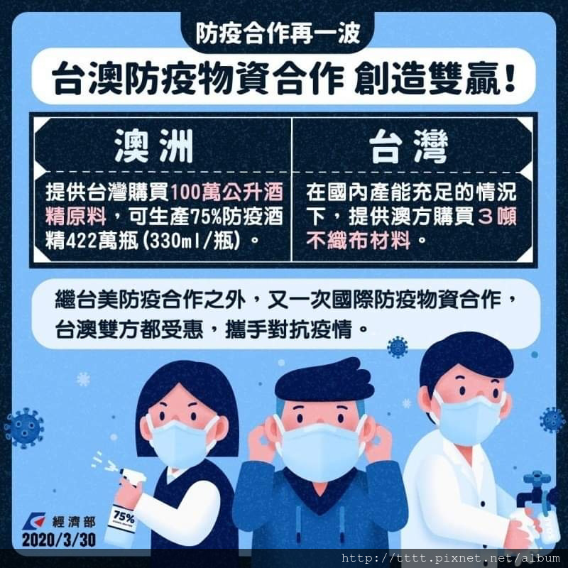 🇹🇼Taiwan partners up with Australia to combat the Coronavirus🤝Following the initiation of “Taiwan-U.S. Joint Statement on a Partnership against Coronavirus”, Taiwan has also reached an agreement with Australia to exchange pandemic prevention materials!👉Australia has agreed to supply 1 million litters of alcohol material for Taiwan to procure, which is can be used to produce up to 4.22 million bottles (330ml, 75%) of sanitizers. 👉In exchange, Taiwan has agreed that if capacity is adequate, to sell Australia 3 tons of non-woven fabric.This collaboration will allow Australia and Taiwan to acquire the necessary medical materials to fight the coronavirus outbreak and benefit the people of both countries alike.This pandemic has allowed the world to see Taiwan’s strength in pandemic prevention as well as its manufacturing capabilities.😏 We welcome all like-minded countries to follow suit and collaborate in the fight against pandemic.